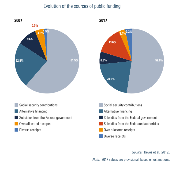 Public financing of the compulsory health insurance is only partly funded through this financial global management, the rest being financed by “own receipts”. Social security contributions are the main public funding revenue sources (52.6% of the public financing of health in 2017, based on KCE estimates) but their share has slightly decreased compared with 2007. The other sources of public financing of health include alternative financing (mainly from VAT), government subsidies, own allocated receipts and diverse receipts (see Fig3.7 and Devos et al. (2019) for details). The decrease in the share of social security contributions is the result of, on the one hand, an increase in direct government subsidies as a source of finance related to the transfer of competences to the Federated entities in the 6th State Reform, and on the other hand, a tax reform to lower labour costs, which in particular led to a reduction of social contributions from employers.