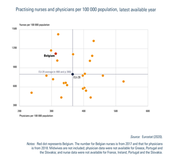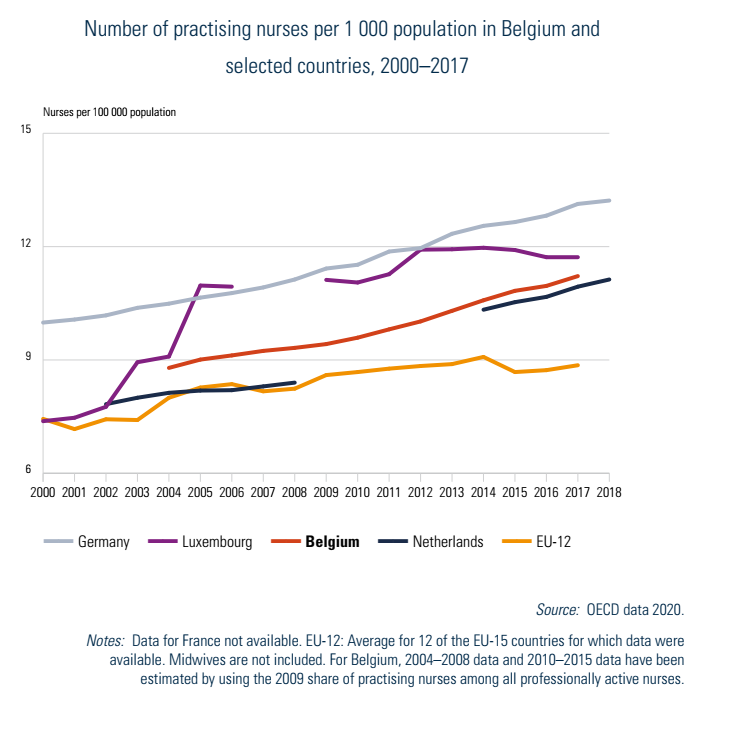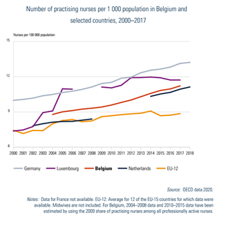 The number of practising nurses has increased in Belgium (from 8.8 per 1000 inhabitants in 2004 to 11.2 per 1000 inhabitants in 2017). This increasing trend is also observed in other European countries. In Belgium the number of practising nurses per 1000 inhabitants is above the European average of 8.9 per 1000 inhabitants based on 12 EU countries (Fig4.5) (OECD data 2020).