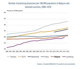 The overall number of practising physicians increased from 28 999 (283 per 100 000 population) in 2000 to 35 762 in 2018 (313 per 100 000 population), which is below the EU15 average (see Fig4.3 and Fig4.4). It is nevertheless important to note that the definition of practising physicians varies across countries.