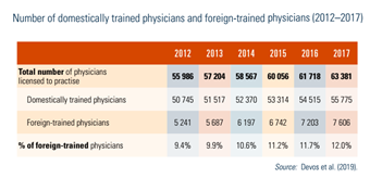 Table4.3 shows that the proportion of foreign-trained physicians in Belgium is increasing, from 9.4% in 2012 to 12% in 2017, but is still below the average of 13.9% in 2017 (based on 10 European countries). This includes licensed physicians, which does not imply that they are practising in the Belgian health care system. In 2017, half of all foreign-trained physicians came from France (18%), Romania (17%) and the Netherlands (16%) (OECD, 2019a). In 2019, a new law installed a quota for non-EU foreign-trained physicians (see Section 4.2.1 Planning and registration of human resources).