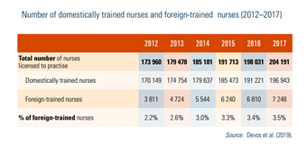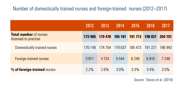 Among all nurses licensed to practise in Belgium, the share of foreign-trained nurses has been increasing over time (from 0.5% in 2000 to 3.5% in 2017) and is in line with the EU average. Concerning nationality, 13% of practising nurses in the French community have foreign nationality, mostly from France (6.6%), compared with 2% in the Flemish community (MoH, 2019d). Table4.4 shows the number of domestically trained and foreign-trained nurses in Belgium.