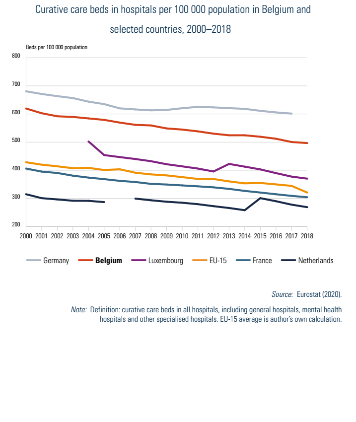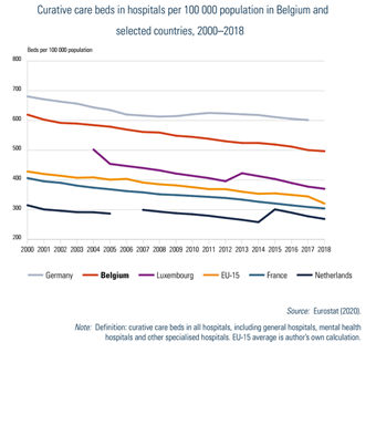 The density of curative care beds decreased to 496.7 per 100 000 population in 2018. Compared with Belgium’s bordering countries, only Germany has a higher bed density (Fig4.1). A projection study on the required hospital capacity for 2025 concluded that there will be a decreased need for traditional hospital beds (−5.4%) especially maternity beds and surgical beds, but indicated a higher need for day hospitalization, geriatric beds and chronic care beds (Van de Voorde et al., 2017).