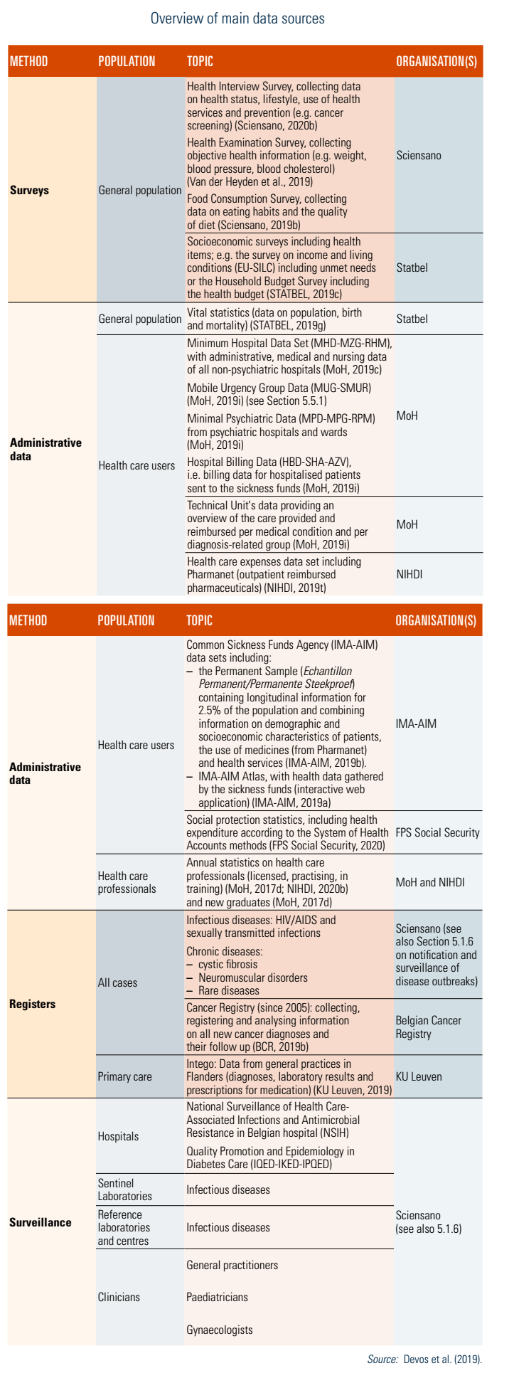 Belgium has made improvements in the field of health information, partially due to the efforts in eHealth, the regular assessment of the performance of the health system (see Chapter 7), the periodic health interview surveys, the collection of death certificate registration at national level, and the creation of Healthdata.be, an IT platform designed to centralize data for health research (Sciensano, 2019d). Yet, while a substantial amount of data is collected, important challenges remain (Devos et al., 2019). Some of the collected data are not used, and for other areas only limited data are available, for example, nursing, primary care, psychiatry, older people’s homes and nursing homes, and non-reimbursed payments. The lack of a Unique Patient Identifier between databases does not allow the tracking of readmissions or patient follow-ups in the health system after discharge. Additionally, coupling of data sources can take a lot of time, where linkage is carried out on an ad hoc basis rather than systematically.