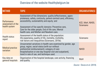 Moreover, since 2019, a new website, healthybelgium.be, brings together assessment reports on performance and other key data in health care (see Table2.3).