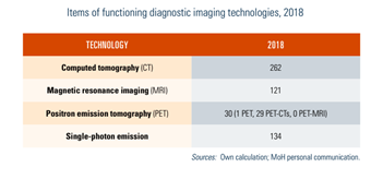 There are licensing criteria for the installation and running of heavy medical equipment (see Section 2.4.2) and since 2016, a national register has been established (BS-MB 3 February 2016). An operating licence granted by the Federal Agency for Nuclear Control is also required. Moreover, there is national planning to establish the maximum number of magnetic resonance imaging (MRI) and positron emission tomography (PET) scan devices (BS-MB 8 August 2014b; BS-MB 8 August 2014c; MoH, 2018b). Heavy medico-technical services such as medical imaging services with MRI or PET scan, radiotherapy services and dialysis centres are also subject to specific licensing criteria and national planning on number and distribution throughout the country (BS-MB 30 August 2000; Crommelynck, Degraeve & Lefèbvre, 2013).