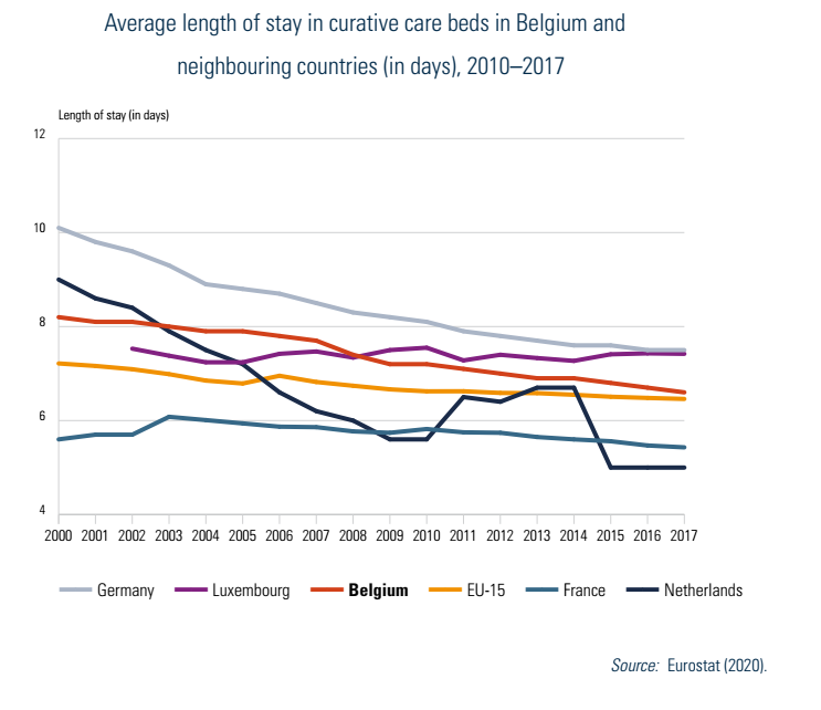 Between 2000 and 2017, the average length of stay (ALOS) in inpatient curative care beds decreased from 8.2 days to 6.6 days, which is in line with neighbouring countries (see Fig5.2). Multiple factors have contributed to the decrease over time, including financial incentives to increase efficiency and shorten stays, medico-technical progress, the development of home care services and the expansion of day care. A projection study predicted a further reduction of ALOS to 5.94 days in 2025 (Van de Voorde et al., 2017).[13] Examples of initiatives to decrease length of stay concern the inpatient stays of women with normal deliveries (see also Box5.5). The ALOS for a normal birth is considered an appropriate indicator for the efficient use of health care services due to the comparable case-mix of patients. In Belgium, the ALOS for a normal birth decreased from 4.96 days in 2010 to 3.11 days in 2016, which is now close to the EU15 average (2.8 days in 2016; data available for 13 countries).