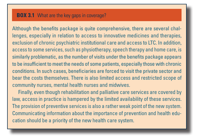 Under the GeSY, almost all costs of statutory benefits are covered by the HIF. This, combined with low co-payments and annual caps, aims to ensure a high level of financial protection without any serious financial barriers to access. Problems with the financial burden on beneficiaries may arise in cases where there are gaps in coverage and difficulties in access and availability of services, as described in Box3.1.
