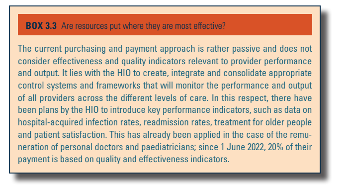 In addition, there is more room for effective monitoring of providers regarding abuses of the system (see Section 7.6.2). Institutionally, the power lies with the single purchaser and not with the providers. However, financial resources do not seem to be directed in a way that explicitly promotes efficiency and quality. The HIO has begun to consider these issues, but so far the measures taken have been limited (Box3.3).