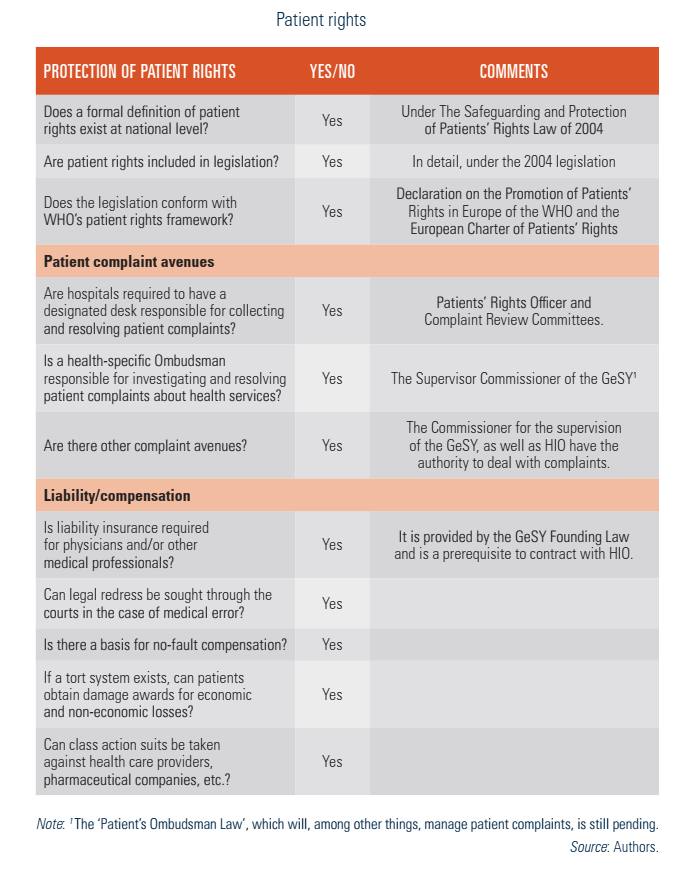The basic rights of patients within the GeSY – namely rights to health care and treatment, freedom of choice and equal access to all legal residents – have been achieved to a great extent. Nevertheless, there remains room for improvement in issues such as confidentiality, quality of services, safety, avoidance of suffering and pain, making a complaint and compensation.