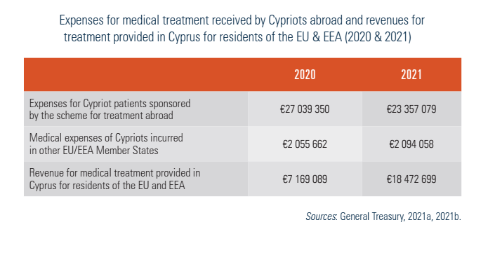 For health care services that are not provided in Cyprus, the MoH also implements a sponsored patient scheme for treatment abroad. The scheme concerns mainly positron emission tomography (PET) scan examinations, transplants and specialized paediatric cases, and, in 2021, dispersed just over €23 million in sponsorship. The countries to which they are sent for treatment are primarily Greece, Germany and the United Kingdom. The MoH also records the revenues from medical treatments provided in Cyprus for residents of other EU/EEA Member States. The total amount for 2020 was €7 169 089, which increased to €18 422 699 in 2021 (General Treasury, 2021a, 2021b).