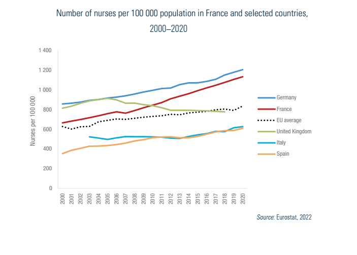 Similar to Germany and Spain, the number of nurses per 100 000 inhabitants (based on Eurostat data) increased in France between 2000 and 2020, from 666 to 1134 (+70%). The increase has been steeper than for the EU average (from 629 to 837 per 100 000, +33%) (Fig4.6). However, the density of nurses (nurses per capita) should be compared with caution across countries, due to large differences in nursing education and roles.