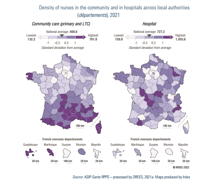 According to national data, in 2021 the density of nurses was 1133 per 100 000 inhabitants (DREES, 2021a).While the number of nurses is high in the hospital sector (727 per 100 000 inhabitants), it is significantly lower in the primary and LTC sectors (407 per 100 000) (DREES, 2021a; see also Fig4.7).