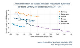 One attempt to provide a very cursory illustration of how the health system is performing in terms of input costs and outcomes is to plot current expenditure on health against the amenable mortality rate. Although we must be mindful that it is not possible to effectively disentangle the role of health behaviour and other determinants of the health care system in influencing the level of amenable mortality, Fig7.9 provides a useful entry point for discussion. Germany’s amenable mortality rate has been falling continuously, but it has remained higher than in neighbouring countries throughout the years 2011–2017; at the same time, the country recorded the second highest health expenditure level in 2017, after Switzerland (Fig7.9). The results suggest that the other countries have been able to secure better outcomes on this metric at lower cost (except for Switzerland, whose health expenditure far exceeds that of all the other countries).