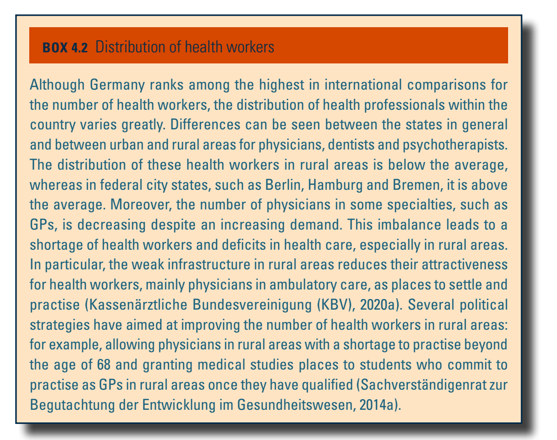 Based on data for 2018, a total of 515 640 physicians were registered with the Federal Chamber of Physicians. Of these, 392 402 were active and 123 238 retired or not active as physicians. Of all active physicians, 201 811 practised in hospitals (51%) and 157 288 in ambulatory care (40%). Another 33 303 physicians (8%) worked in the public health care sector, administration, government or other sectors (e.g. pharmaceutical industry). In 2018 there were 473 active physicians per 100 000 population, or one active physician per 211 population according to the Federal Chamber of Physicians. The distribution of physicians varies greatly within Germany (see Box4.2), from 400 practising physicians per 100 000 population in Brandenburg to 724 practising physicians per 100 000 population in Hamburg (Bundesärztekammer, 2018; GBE-Bund, (2020c).