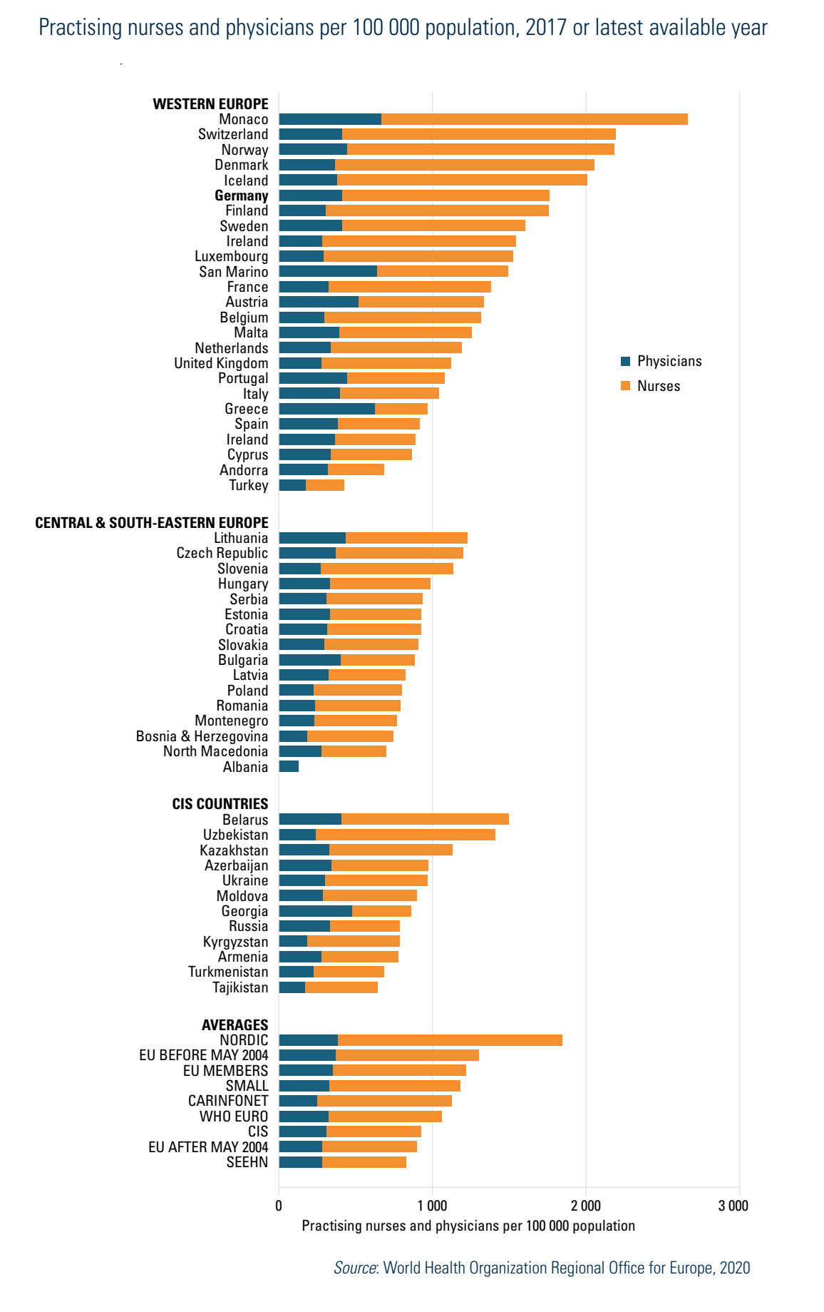 Fig4.3 compares the numbers of practising physicians and nurses per 100 000 population in the WHO European Region, using WHO Health for All data. Norway, Switzerland and Iceland have the largest numbers of physicians and nurses per 100 000 population. Germany, with 431 physicians and 1322 nurses per 100 000 population, is ranked sixth in western Europe.