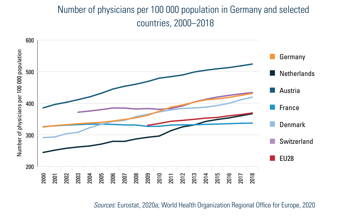 According to Eurostat data from 2018, the average of 431 practising physicians per 100 000 population in Germany[16] was above the EU28 (369 per 100 000) average. The density of physicians was below the number of 524 per 100 000 in Austria and 434 per 100 000 in Switzerland but higher than the other comparator countries featured in Fig4.4 (Eurostat, 2020b). Although the number of physicians in general has increased continuously in recent years, the number of GPs has decreased, both in relation to the population and especially in relation to all physicians, the latter from 27% in 2000 to 23% in 2017 (World Health Organization, 2020a) (see section 5.3 Primary care). Another trend highlights the growing feminization of the health sector: while in 1991 a third of the medical profession was female, in 2018, 47.2% of all practising physicians were female (Bundesärztekammer, 2018).