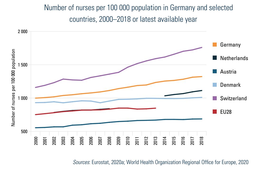 According to Eurostat data, in Germany there were 1322 practising nurses per 100 000 population in 2018, which is above the EU28 average, and the highest among the selected countries, except for Switzerland (1759 per 100 000) (Fig4.5).