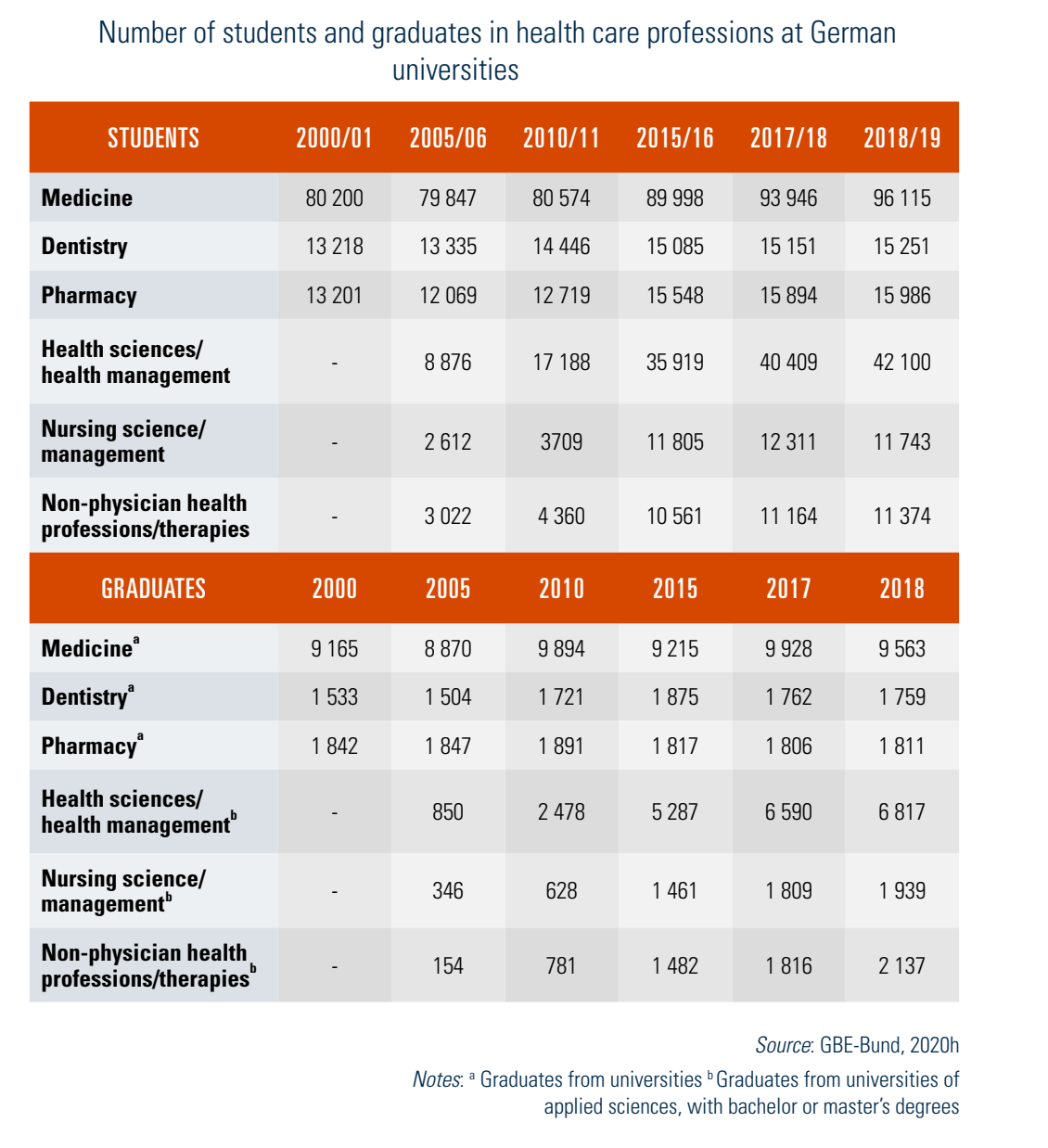 In 2018, of the 13 336 physicians obtaining a specialist degree, 15.4% were internists, 11.7% GPs, 9.5% anaesthesiologists, 6.6% orthopaedics, 5.1% gynaecologists and 4.8% paediatricians (Bundesärztekammer, 2018). In addition to the general “academization” of nursing that has led to the start of degree qualifications, a large number of full-time or part-time postgraduate and continuing education courses at bachelor and master level are offered in the fields of nurse education, (quality) management, nursing sciences, public health, health or therapy sciences. These are aimed at people with professional training in a health profession as well as graduates of undergraduate courses of study.