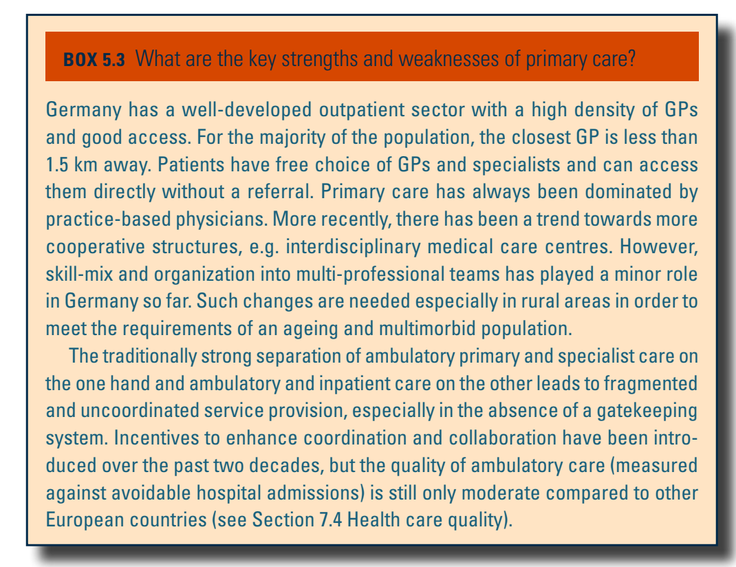 Since 2004 sickness funds have been obliged to offer their insured the option of enrolling in a GP-centred model (Hausarztzentrierte Versorgung) (§73b SGB V) and some provide a bonus for complying with the gatekeeping rules. Participation in these models is voluntary for both providers and the insured. According to data from the German Association of General Practitioners (Deutscher Hausärzteverband), 17 000 GPs participate in “GP-centred care models” and about 5.4 million insured had subscribed in 2020 (Deutscher Hausärzteverband, 2020).