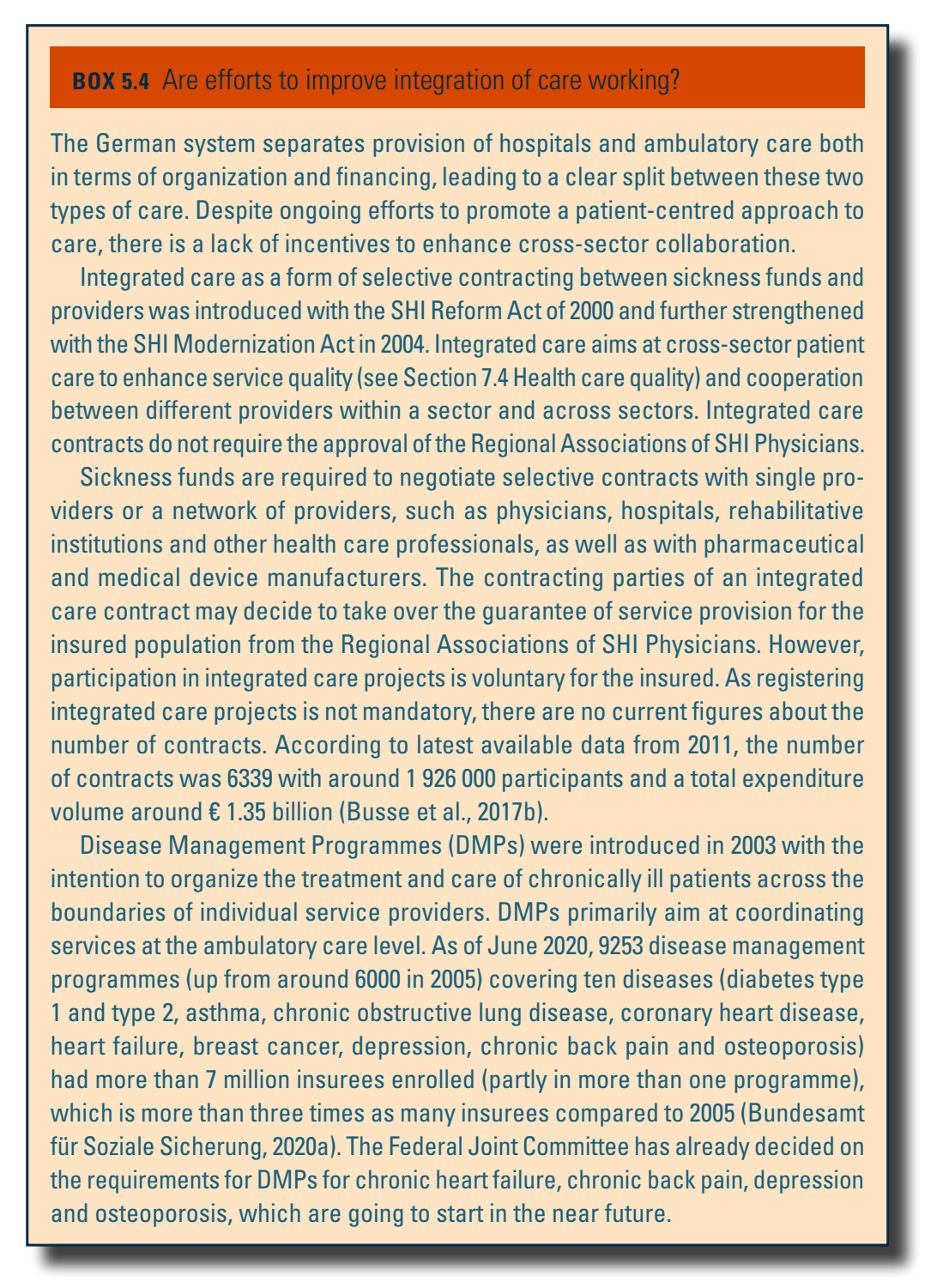In Germany, the organization and financing of hospital and ambulatory care are separated. Several instruments were installed over the years to provide high-quality patient-centred care and to overcome the split between the two sectors. These include pre- and post-inpatient care, that is, hospital treatments without an overnight stay to prepare for or follow-up on an inpatient stay. Also, day care is typically provided in specific day care clinics, mostly covering psychiatric and geriatric care. Thirdly, hospitals can offer outpatient/day-case surgery for a limited number of treatments. For these, hospitals receive the same remuneration as office-based physicians. Despite these efforts, specialized care remains largely separated between hospital and ambulatory care.