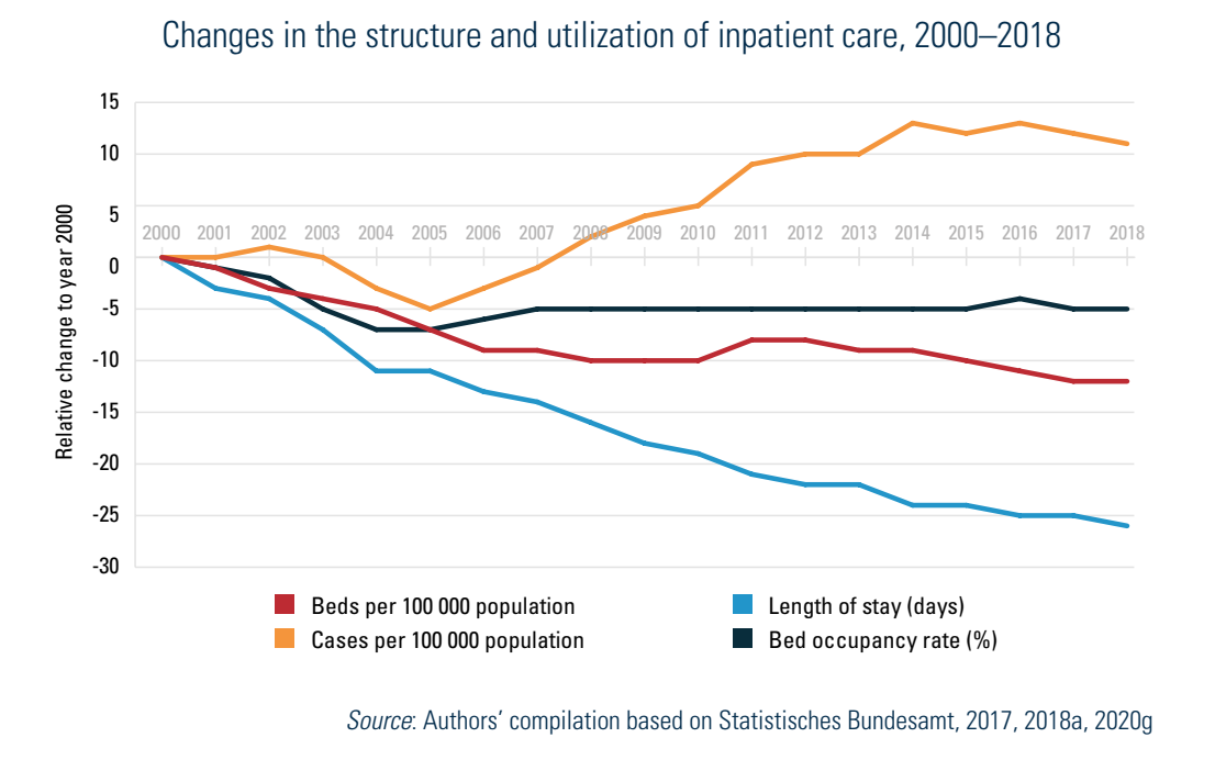 Fig5.3 shows the development of inpatient care (both structure and utilization data) for hospitals in Germany between 2000 and 2018. During this period the per capita number of general and psychiatric hospital cases rose by 14%, to 23.7 cases (admissions) per 100 population. During the same period the total number of beds decreased by 12%, from 681 beds to 601 beds per 100 000 population in 2018 (see also section 4.1.1 Infrastructure, capital stock and investment). Although the number of cases increased and the number of beds decreased, occupancy rates also decreased from 81.5% in 2000 to 77.1% in 2018. This resulted from the relatively strong decrease in the average length of stay, from 9.7 to 7.2 days. The trend of increasing admissions was pronounced in the period 2007 to 2014, while the trend of decreasing length of stay is an old phenomenon not as strongly related to the introduction of DRGs for hospital payment as is often assumed (see section 3.7 Payment mechanisms).