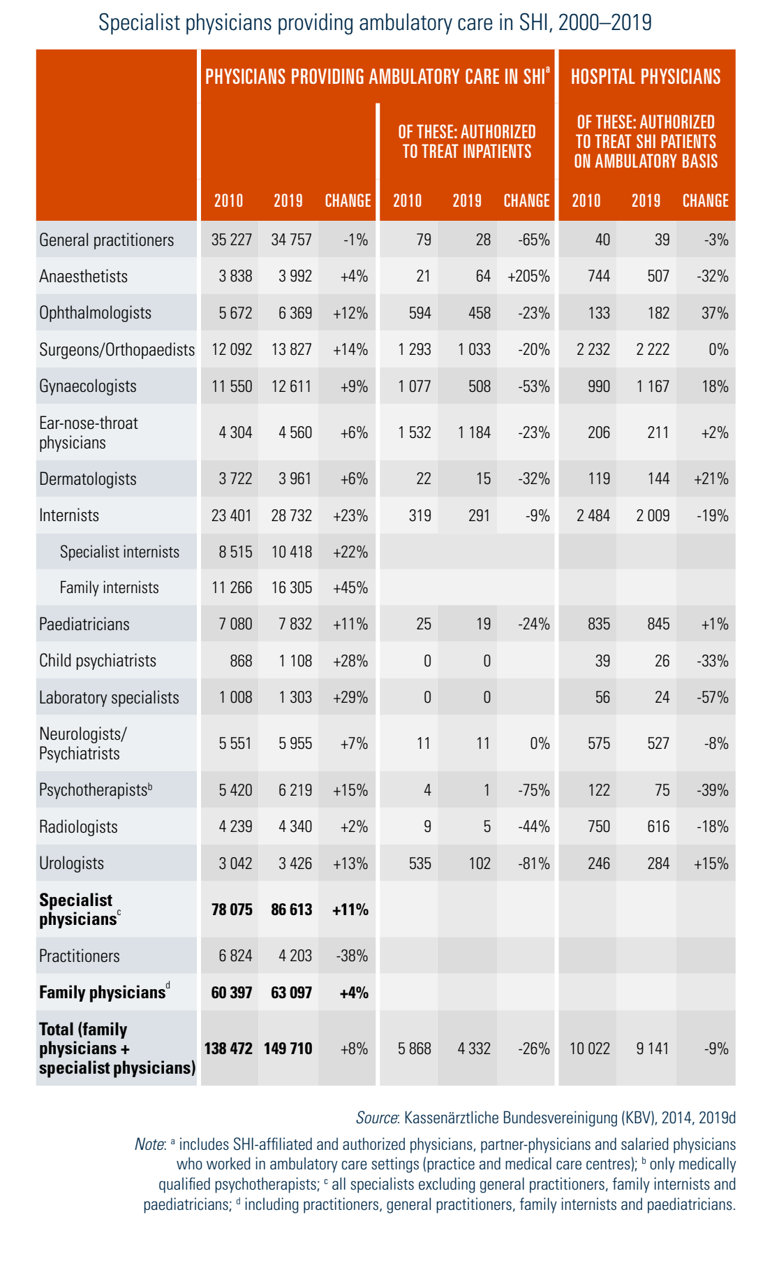 Ambulatory physicians offer almost all specialties; the most frequent ones are listed in Table5.1. Except for a few specialties, e.g. radiology or laboratory services, patients can directly access ambulatory care specialists without a referral. Between 2010 and 2020 the total number of physicians in SHI care increased by 8%. However, the strength of this trend varied according to specialty: whereas the number of GPs decreased by 1%, the number of child psychiatrists increased by 28% and the number of internists by 23%.