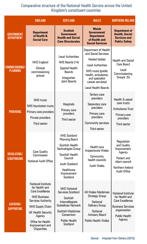England, Scotland, Wales and Northern Ireland each has its own regulatory bodies, including the Care Quality Commission and NHS England, Healthcare Improvement Scotland, Healthcare Inspectorate Wales, and the Regulation and Quality Improvement Authority in Northern Ireland (Table2.1).