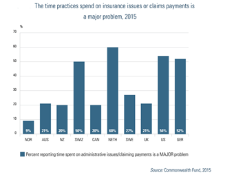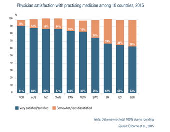 Finally, we examine two aspects of physician satisfaction. Fig7.9 shows physician satisfaction with practising medicine in 10 countries. Satisfaction in the United States is relatively low compared to most of the other countries, ranking ninth or tenth, with 36% reporting that they are somewhat or very dissatisfied. Fig7.10 shows that a major problem is the proportion of time spent on administrative issues or difficulty receiving payment. As in the previous graphic, US physicians are the second least satisfied, with more than half reporting this complaint.