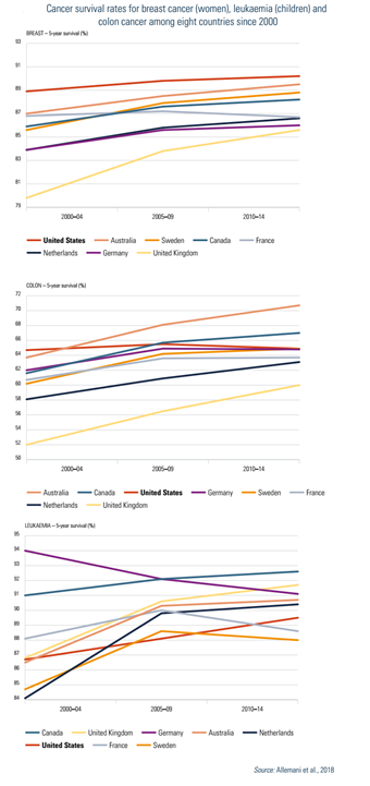The United States has the highest survival rate for breast cancer, at 90%, and has been the highest over the 10-year period examined. Rates for the other countries are not too far behind, all exceeding 85%. The United States is closer to the average for colon cancer survival, at 65%. Again, the countries are fairly tightly bunched, all with rates between 65% and 71%. This is even more true for leukaemia survival, with all countries having rates in the narrow range of 88–91%, with the United States slightly lower than the average.