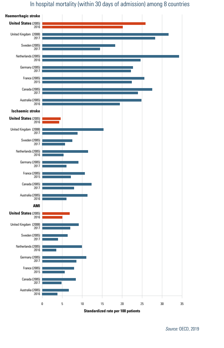 Fig7.7 shows in-hospital mortality (within 30 days of admission) for the same eight countries, for three illnesses: haemorrhagic stroke, ischaemic stroke and AMI. US performance varied by condition. It has by far the best rates with regard to ischaemic stroke mortality, with figures one third less than the second best-performing country, and half those of Canada and the United Kingdom. In contrast, the United States ranked sixth in AMI mortality and fourth in haemorrhagic stroke mortality.