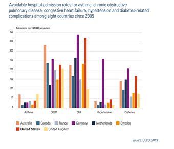 Fig7.8 shows avoidable hospital admission rates among the same eight countries for five diseases and conditions: asthma, COPD, congestive heart failure, hypertension and diabetes. In most cases the United States fares poorly in international comparisons, with the highest rate for asthma and the second highest for heart failure, hypertension and diabetes. It was among the median for COPD. The reason for its poor relative performance likely varies by disease/condition. In the case of asthma it most likely relates to cost-related access barriers. In the case of diabetes, high obesity rates are likely a cause.