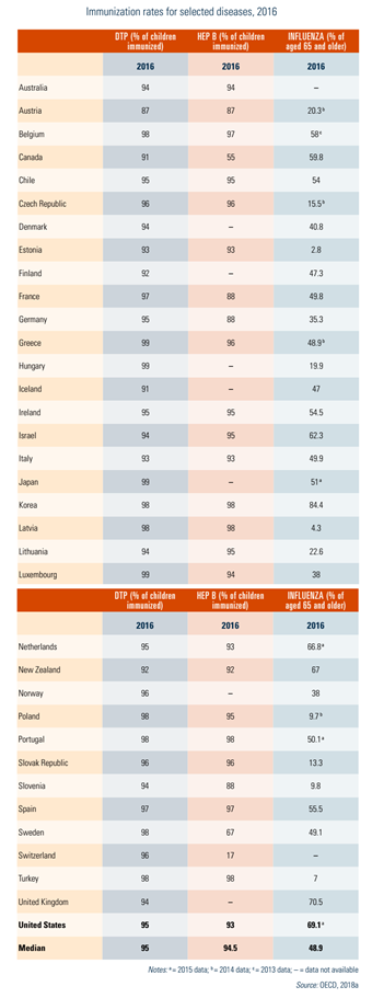 Beginning with immunizations, Table7.4 shows immunization rates in 2016 among the high-income OECD countries for three diseases: diphtheria, tetanus and pertussis (DTP); hepatitis B; and influenza. The first two show the percentage of children immunized; for influenza it is the percentage of the population aged 65 and older.
