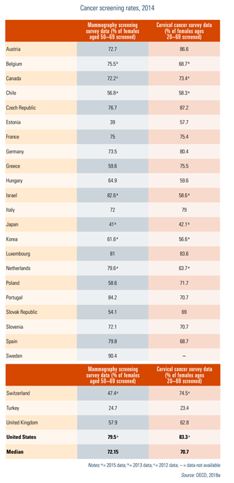 Table7.5 shows screening rates for breast cancer (mammography) and cervical cancer (Pap smears) for 2014, the most recent year with complete data. The OECD data present both population survey data and programme data; shown here is the former because there are no programme data available for the United States. Of the 26 countries compared, the United States was among the top performers in both screening tests, 7 percentage points above the median for mammography and 13 percentage points higher for cervical cancer screening.