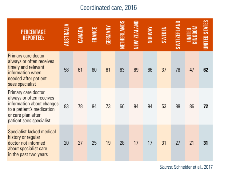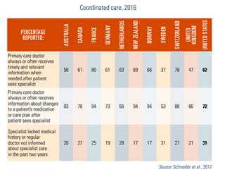 Table7.6 examines three aspects of care coordination: (1) primary care doctors always or often receiving timely and relevant information after a patient sees a specialist; (2) primary care doctors always or often receiving information about changes to a patient’s medication or care plan after a patient sees a specialist; and (3) specialists lacking medical history or regular doctors not informed about specialist care. The United States was at the median for the first measure of coordination, but third lowest for the second measure and tied for lowest in the third measure. Thus, compared to other countries, care coordination is a problem.