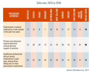 Table7.7 examines patient safety. Three facets are shown: (1) a patient experienced a medical, medication or laboratory mistake; (2) a primary care physician reported electronic clinical decision support in their practice, and (3) a health care professional did not review medications in past year (among those taking two or more prescriptions). The United States had the second worst performance on the first measure, but the best performance on the last. Regarding electronic support, the United States performed above the median.