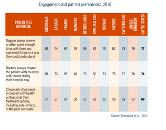 Table7.8 examines three measures of the doctor–patient relationship: (1) regular doctor always or often spent enough time with patient and explained things in an understandable way; (2) doctor always treated patient with courtesy and respect during hospital stays; and (3) chronically ill patients discussed treatment options with their health professionals. In each of the three measures, US performance was around the median.