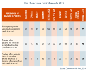 Table7.9 examines three ways in which primary care practices report using medical records: (1) the practice uses EMRs; (2) the practice offers patients the option of emailing queries to practice providers; and (3) the practice offers patients the option to view online, download or transmit information from their medical record. The United States was not very different from average for the first two measures, but had the highest figure, by far, in allowing patients to use information electronically from their medical records.