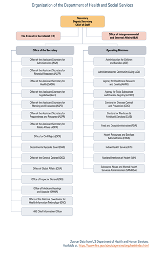 HHS is the key health agency in the United States. It has broad responsibilities for carrying out the instructions of the Congress and the administration regarding finances, planning/coordination, administration and regulation, as well as the provision of health services. The agency’s head carries the title of “Secretary” and is named by the President with the consent of the Senate. He or she also sits in the President’s Cabinet. HHS has a budget of about 28% of all federal outlays with over 80 000 employees (OMB, 2018). Its various components administer grants and provide/purchase health insurance for about one-third of the population. HHS coordinates and monitors the performance of many state and local health organizations. The financing for many programmes that are jointly administered at the federal government, state and local level flows through HHS. The department includes more than 100 programmes across 11 operating divisions, covering a wide spectrum of activities. These programmes not only provide services nationwide but also enable the collection of national health and other data (US Department of Health and Human Services, 2018).