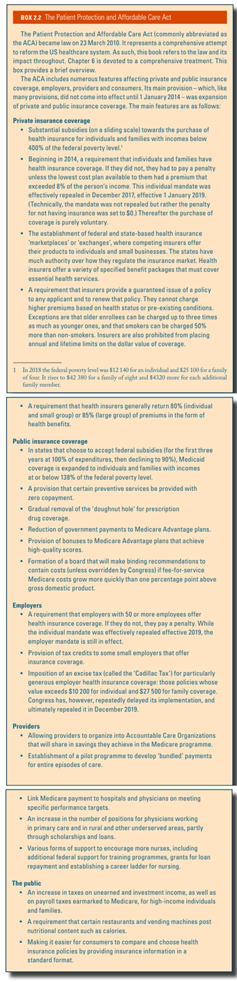 Efforts to reform the health system in the United States date back several decades. These efforts are reviewed in section 2.1 and Box2.2. In many ways the ACA represents the next step in a process that began with the passage of Medicare (public insurance mostly for the elderly) and Medicaid (public insurance for some of the poor) in 1965.