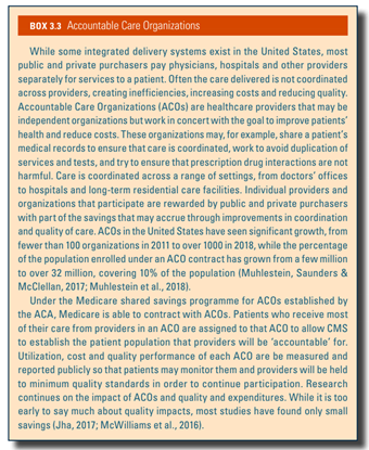 The bundled payments for care improvement initiative in the ACA are another policy intended to control costs. It is voluntary and offers physicians, hospitals and other providers a single payment to cover all medical services required to care for a patient for a specific episode of illness (a specific medical condition or problem of expected limited duration). Traditionally, providers have been paid separately for each service received by a patient, a practice that some believe increases costs (US Department of Health and Human Services, 2011c). The Trump Administration modified this programme in ways that resulted in some providers declining to continue to be compensated for Medicare patients this way because they fear an overall reduction in payments (Dickson, 2018).