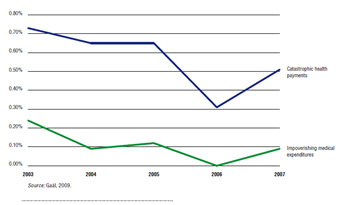 Looking at these indicators over time shows that between 2003 and 2006, there was a decrease in the percentage of catastrophic and impoverishing health expenditure, followed by a notable increase in 2007 (Fig7.1). This increase coincides temporally with the introduction of several health policy measures, including user fees in ambulatory and inpatient care (see section 3.4) and an increase in and restructuring of cost-sharing for pharmaceuticals (2006/8).