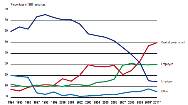 In 1998, contribution rates were decreased further and contribution collection was transferred from the NHIFA to the more authoritative Tax Office, with the aim of making collection less susceptible to tax avoidance, whereas the governance structure of the HIF and NHIFA were reorganized. The employer share of contributions was decreased by another four percentage points to 11% in 1999 (and remained at this level until 2006), while the employee contribution had been lowered by 1% in 1998 (Table 3.5). The government abolished the ceiling for the employee health insurance contribution (2000/8) and added a proportional component to the hypothecated health care tax (see above). The government in power between 2002 and 2006 basically upheld this policy as did the next administration, which further reduced the employer contribution rate from 11% in 2006 to a symbolic 2% in 2010. At the same time, the employee contribution rate increased from 4% in 2006 to 6% in 2010. Over the last 15 years, this policy has resulted in a steep increase in the ratio of employee to employer contribution shares. In the late 1990s, employers provided 75.6% and employees 9.9% of HIF revenue, whereas, in 2011, shares are expected to be around 14.3% and 30.3% respectively, with a parallel increase of the share of the central government to 50.1% (Fig3.6).