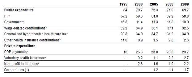 According to the NHIFA, the total transfer from the central government budget, including deficit financing, is planned to be almost five times higher in 2010 (covering 47.5% of the HIF expenditure) than it was in 1997 (covering 10.9%). Hence the role of general taxes in funding of the HIF has become as important as the role of the wage-related contributions. From the perspective of the whole health care system, the share of tax funding among public sources was very high already in 2002 and 2003, when the share of tax funding (with 38.5%) exceeded the share of wage-related contributions (33.6%) in 2003, considering the deficit financing and hypothecated health care tax among tax sources in the budget of the HIF (Table3.4).