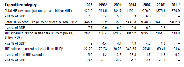 Since the inception of the HIF, its expenditures have always exceeded its revenues with the exception of some fiscal years (1995, 2007 and 2008). This gap has been covered retrospectively at the end of each fiscal year through deficit financing by the government budget. HIF revenues decreased from 7.8% of the GDP in 1993 to 5.5% of the GDP in 2005 (see also Table3.6), while expenditures only fell from 8.5% to 7.2%. The gap between revenues and expenditures peaked in 2005 at 23.8% of total HIF expenditure (amounting to HUF 375 billion or €1.48 billion or 1.7% of GDP). The peculiarity of the budget management stewardship by the Ministry of National Economy is illustrated by the fact that 91% of the gap between revenues and expenditures in 2005 was a planned deficit approved by parliament in 2004 (NHIFA, 2008), while the rest was due almost exclusively to overspending in the pharmaceutical sub-budget. As a result of effective cost-containment measures since 1997, such overspending was not apparent in the inpatient and outpatient health services sub-budgets.