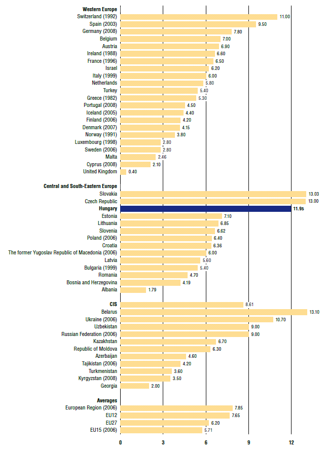 As can be seen in Fig5.1, each person in Hungary had an average of 11.95 outpatient contacts in 2009, which was third among the countries of central and south-eastern Europe after Slovakia (13.03) and the Czech Republic (13.00), and almost twice the EU27 average. High utilization rates in the outpatient specialist sector would not be undesirable if unnecessary hospitalization was avoided as a result. However, acute hospital admission rates in Hungary are also high (17.94 per 100 inhabitants compared to 15.66 for the EU27 average in 2008), albeit following a decreasing trend after the output of hospitals and outpatient specialist providers was limited by the government in 2006 (WHO Regional Office for Europe, 2011) (2006/5).