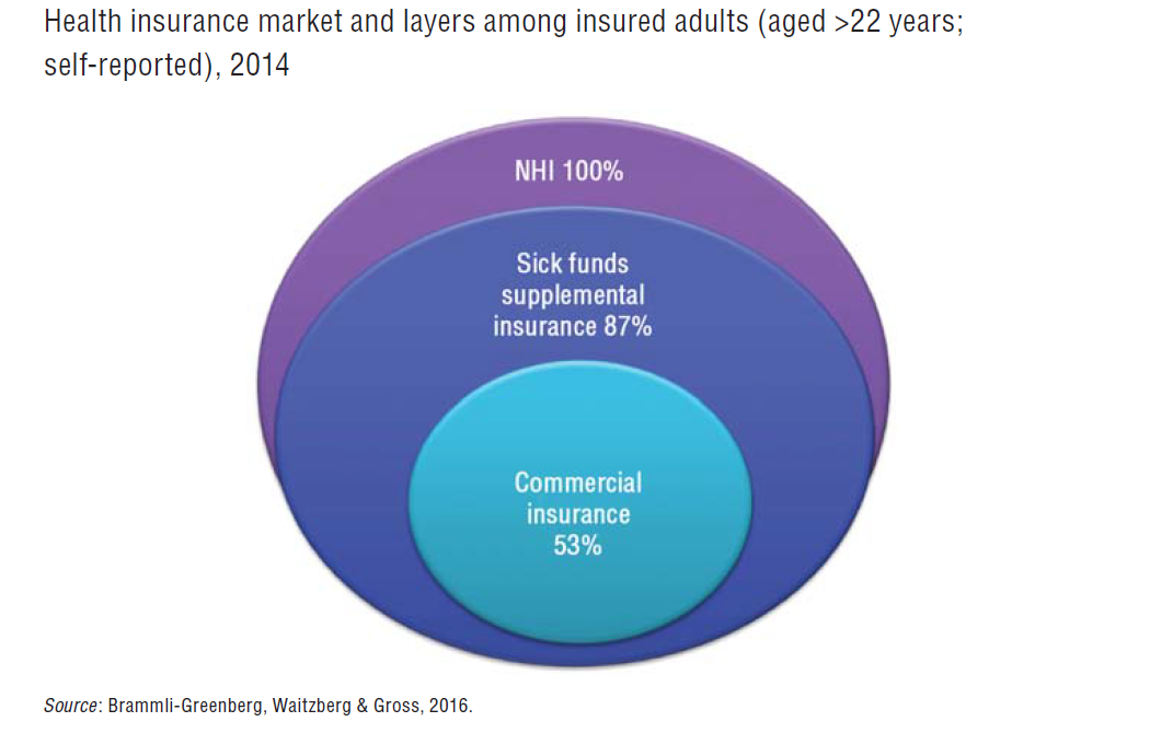 More than 80% of Israeli residents covered by national health insurance (NHI) also have voluntary health insurance (VHI). VHI in Israel is mainly duplicative and is used to access care provided by private hospitals and private health professionals, to shorten waiting times or to choose a particular surgeon. VHI may also be supplementary in order to access services not covered by NHI, such as specific pharmaceuticals or dental care. VHI in Israel is not complementary, as it does not cover user charges for NHI-covered services (Sagan & Thomson, 2016).