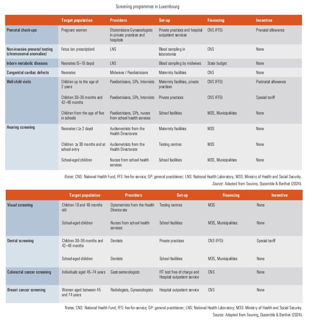Universal screenings during early life years encompass non-invasive prenatal testing for chromosomic anomalies, neonatal screening, cyanogenic cardiac defects and hearing defects, followed by visual screenings at 10 and 40 months of age, and speech and language assessment with hearing tests at 30 months of age (Sante.lu, 2023a).