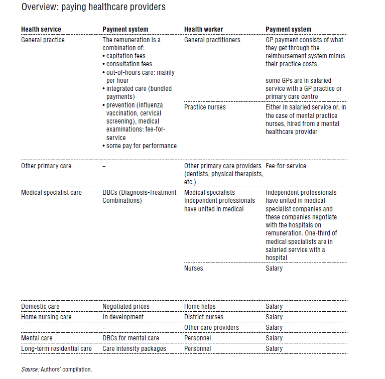 Basic services were financed via four patient profiles: short, middle, intensive and chronic. Specialized care was financed through diagnosis-treatment combinations (DBCs), like DRGs, but including elements of treatment (for example, length of treatment) and inpatient care in the second and third years of treatment via care packages, reflecting intensity of care (zorgzwaartepakketten).