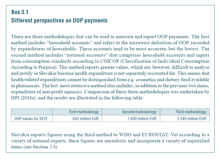There has been controversy about the underlying methodology to capture OOPs in Slovakia for years and criticism towards the Statistical Office to overstate OOPs. This has been tackled by two consequent corrections: 1) In 2010, the Statistical Office overhauled its methodology and re-calculated OOPs accordingly for 2011 and onwards; 2) In 2017, the Statistical Office corrected for receipts sent to the Ministry of Finance (therefore switching to the “household account” methodology) for 2015 and onwards.