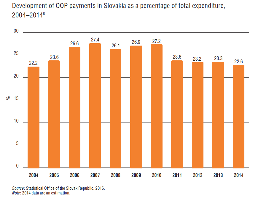 In 2014 Slovakia had a share of 22.6% of total health expenditure paid out of pocket. As illustrated by Fig3.9, the level of OOP payments grew from 2004 to 2007. This was the result of a tax policy change (an increase of VAT on